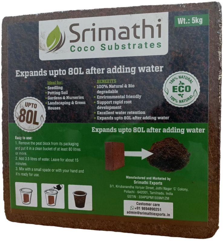 Coir Pith material is compressed at a 5:1 ratio by a hydraulic pressing machine to produce a 5 kg block, which expands up to 75-80 litres by its volume. 5 kg blocks are mostly used in large volumes to prepare plant-based substrates with a mix of perlite, Sphagnum peat moss etc. Coir Pith has the characteristics to mix with any other substrates to give better yield in the plantation.