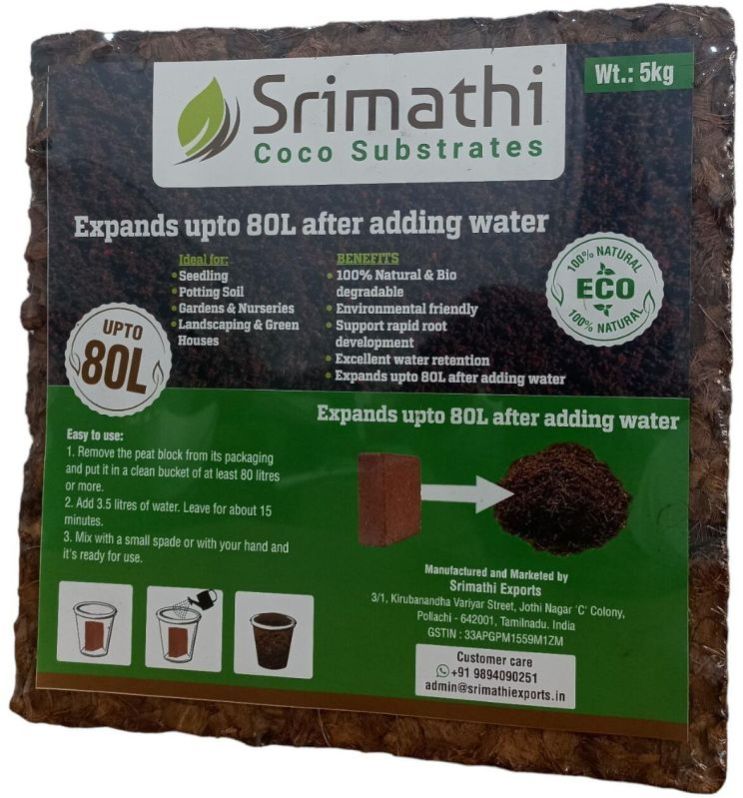 Coir Pith material is compressed at a 5:1 ratio by a hydraulic pressing machine to produce a 5 kg block, which expands up to 75-80 litres by its volume. 5 kg blocks are mostly used in large volumes to prepare plant-based substrates with a mix of perlite, Sphagnum peat moss etc. Coir Pith has the characteristics to mix with any other substrates to give better yield in the plantation.
